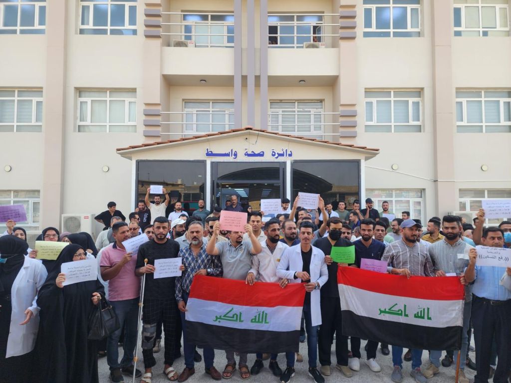وقال المراسل، إن “العشرات من الكوادر الطبية في واسط خرجوا اليوم، بتظاهرة أمام صحة المحافظة”.