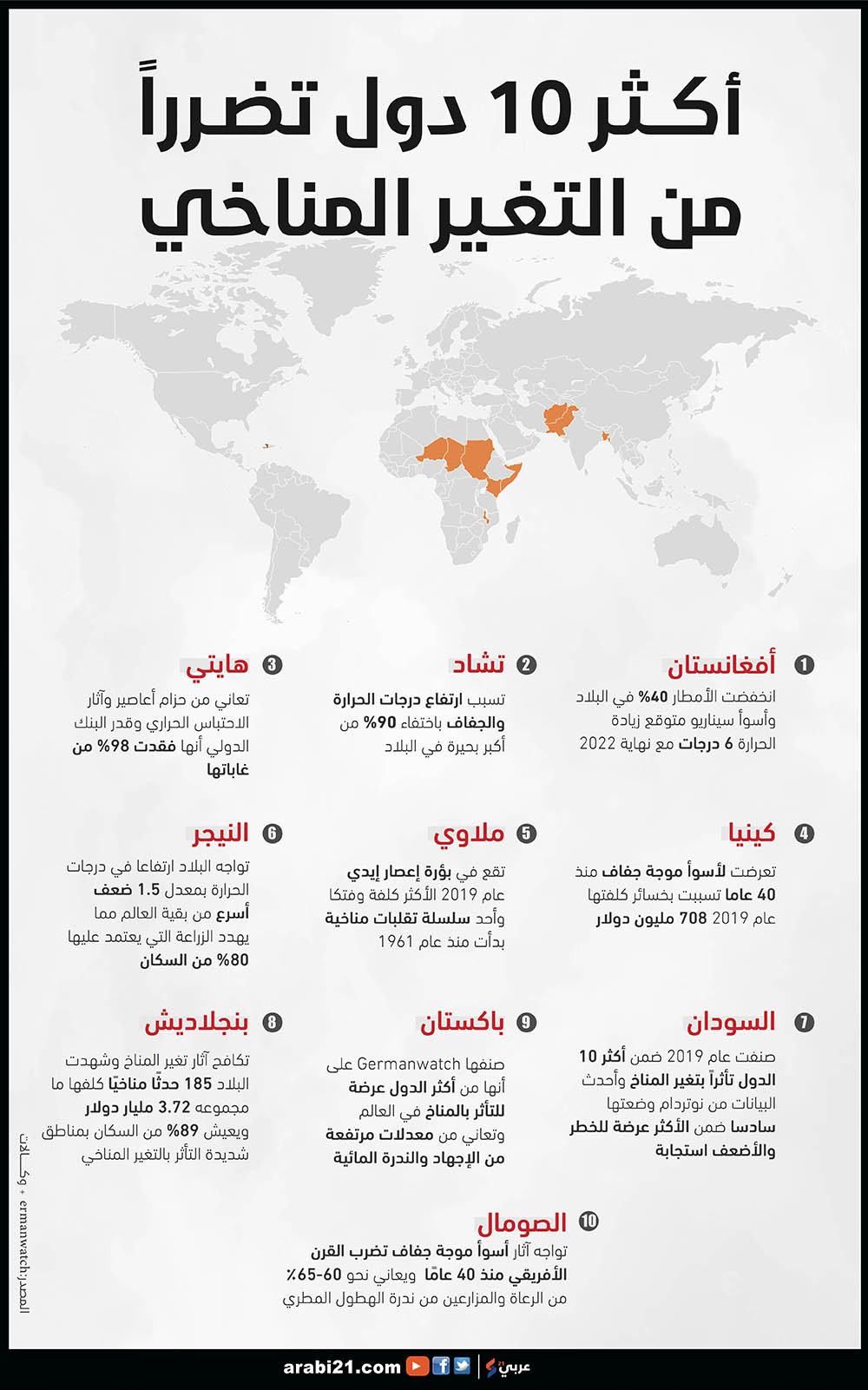 وفي ما يأتي إنفوغراف لأكثر الدول تضرراً من التغير المناخي بالاعتماد على بيانات مبادرة “نوتردام للتكيف العالمي” و”مؤشر Germanwatch”: