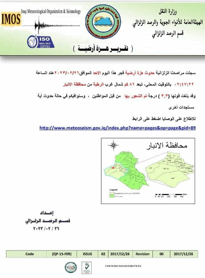 وبين، أن “الهزة الأرضية سجلت في تمام الساعة 02:47:22 فجر هذا اليوم بالتوقيت المحلي وتبعد (86) كم شمال غرب الرطبة من محافظة الانبار“.