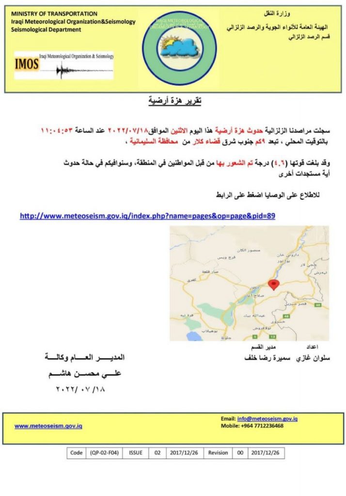 وذكرت الهيئة في تقريرها الذي ورد ..، أن “الهزة الأرضية سجلت في تمام الساعة 11:04:53 صباح اليوم بالتوقيت المحلي، وقد بلغت قوتها (4،6) درجة وتبعد (9) كم جنوب شرق قضاء كلار من محافظة السليمانية”.