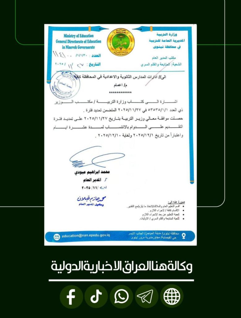تمديد فترة التقديم على نظام الانتساب في محافظة نينوى لمدة عشرة أيام إضافية اعتباراً من 1/12/2025 ولغاية 10/12/2025