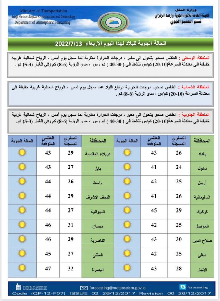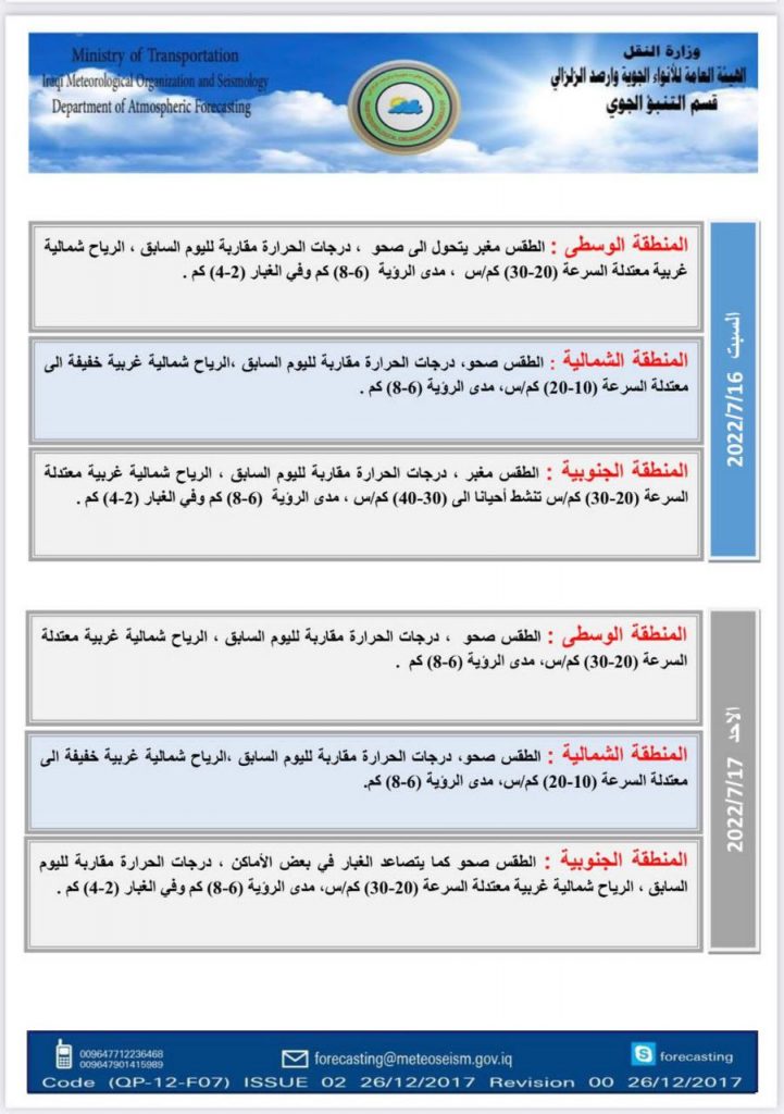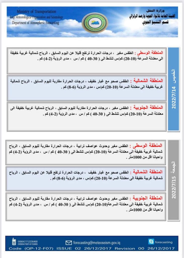 ووفق توقعات الهيئة التي وردت. فإن طقس يوم غد الخميس سيكون مغبراً في المناطق الوسطى والشمالية والجنوبية، ودرجات الحرارة ترتفع قليلاً.