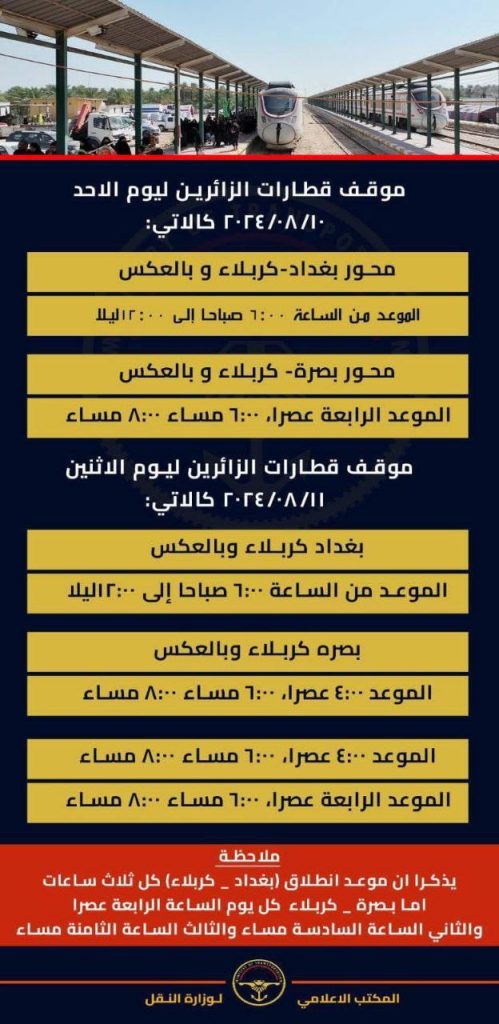 جدول قطارات زائري الأربعين ليومي الأحد والاثنين من بغداد والبصرة الى كربلاء.