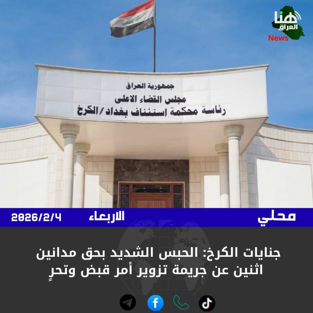 جنايات الكرخ: الحبس الشديد بحق مدانين اثنين عن جريمة تزوير أمر قبض وتحرٍ