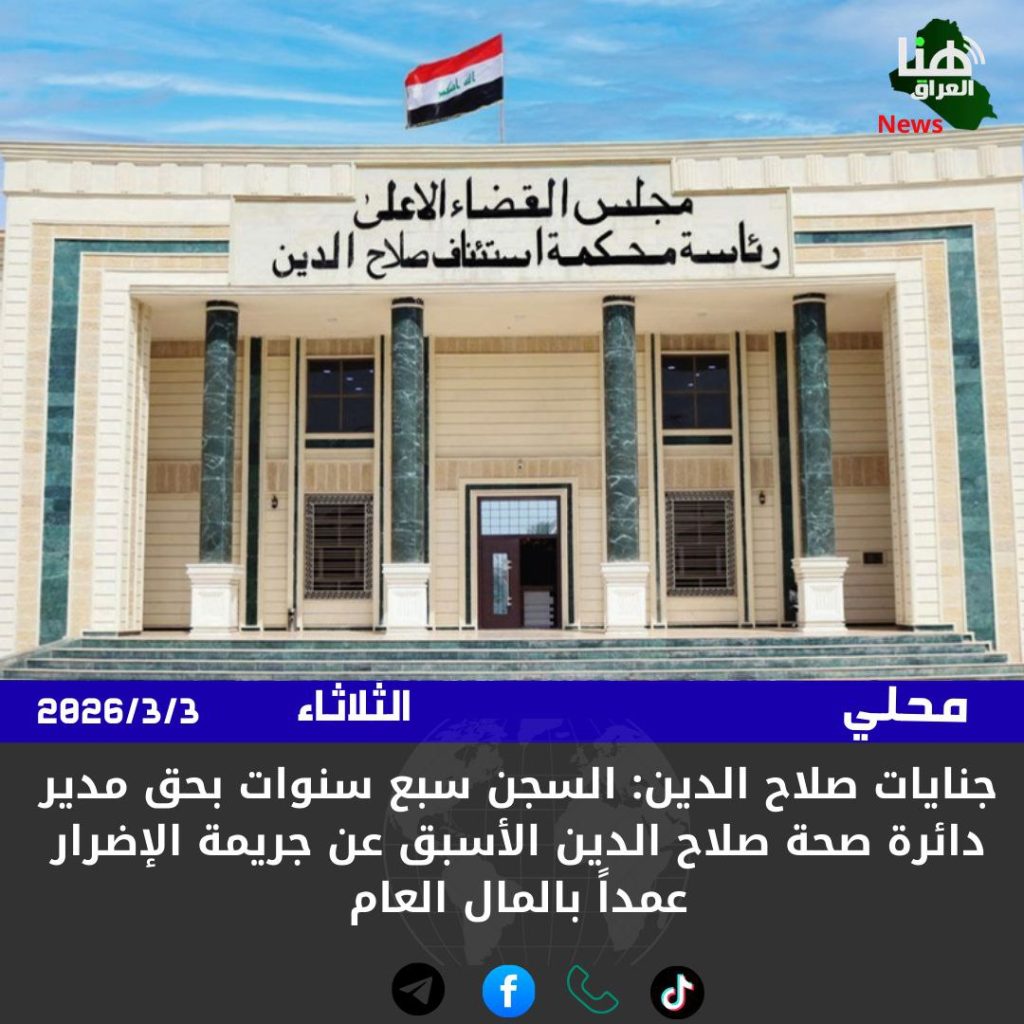 جنايات صلاح الدين: السجن سبع سنوات بحق مدير دائرة صحة صلاح الدين الأسبق عن جريمة الإضرار عمداً بالمال العام