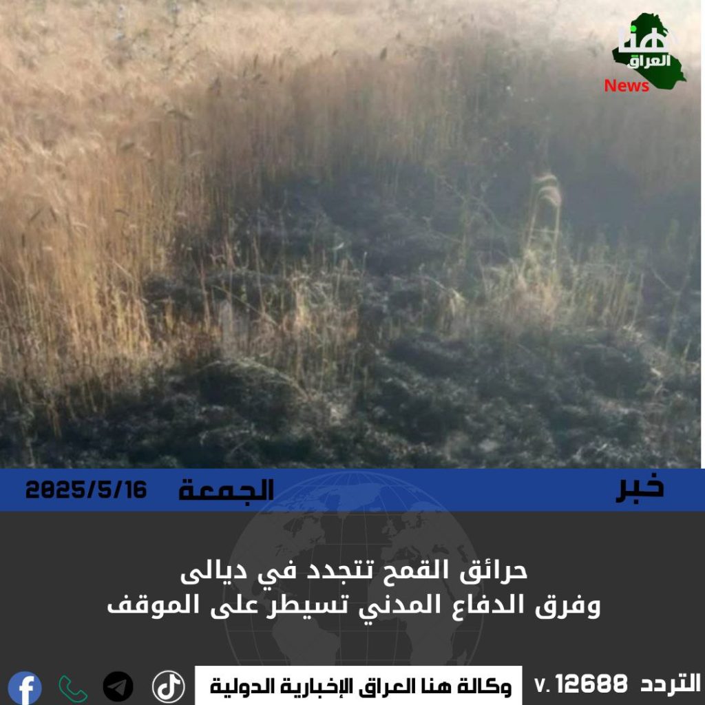 اندلع حريق واسع، اليوم الجمعة، في أراضٍ زراعية مزروعة بالقمح في أطراف ناحية العبارة شمال شرق بعقوبة بمحافظة ديالى.