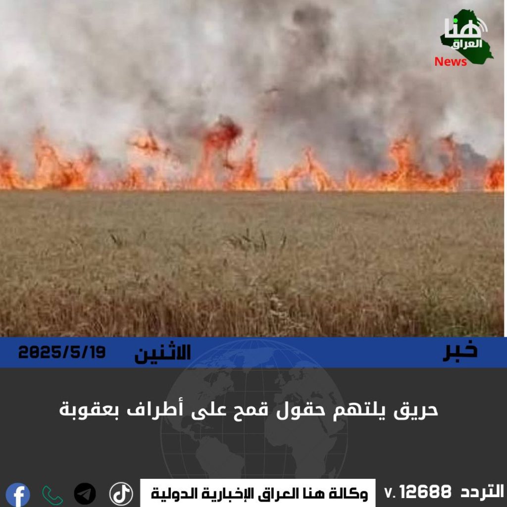 اندلع حريق واسع في أراضٍ زراعية مزروعة بمحصول القمح على أطراف مدينة بعقوبة بمحافظة ديالى، ما أسفر عن خسائر مادية كبيرة بالمحصول.