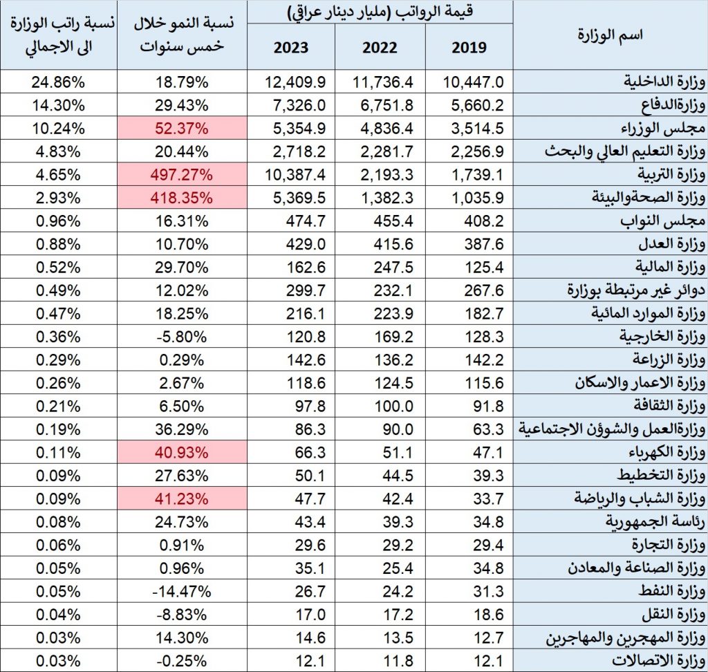 وكانت أكثر الوزارات ارتفاعا بقيمة الرواتب هي وزارة التربية التي ارتفعت رواتبها لتصل الى 10 ترليون دينار عراقي ثم وزارة الصحة والبيئة التي ارتفعت رواتبها لتبلغ 5.3 ترليون دينار عراقي في 2023، وفق الإحصائية التي كشفت ارتفاع رواتب مجلس النواب بمقدار 16% ليبلغ مجمل رواتب مجلس النواب 474 مليار دينار عراقي بعد ان كان في 2019 بحدود 408 مليار دينار عراقي.