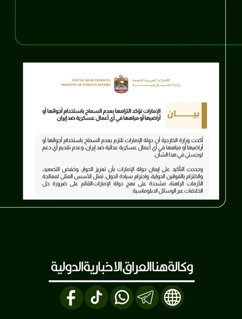 الرئيسية/دولي/دولة الامارات تؤكد التزامها بعدم السماح باستخدام أجوائها او أراضيها أو مياهها في أي أعمال عسكرية ضد ايران وتجدد دعمها ودعوتها للحلول الدبلوماسية وخفض التصعيد في المنطقة. دولي دولة الامارات تؤكد التزامها بعدم السماح باستخدام أجوائها او أراضيها أو مياهها في أي أعمال عسكرية ضد ايران وتجدد دعمها ودعوتها للحلول الدبلوماسية وخفض التصعيد في المنطقة. شاركها فيسبوك X لينكدإن Tumblr بينتيريست Reddit VKontakte Odnoklassniki Pocket مشاركة عبر البريد طباعة