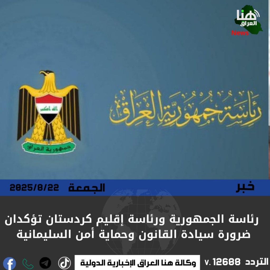 بغداد – أكدت رئاسة إقليم كردستان، اليوم، على سيادة القانون وحماية أمن وسلامة مدينة السليمانية ومنازل المواطنين، في ضوء الأحداث التي شهدتها المحافظة مؤخراً.