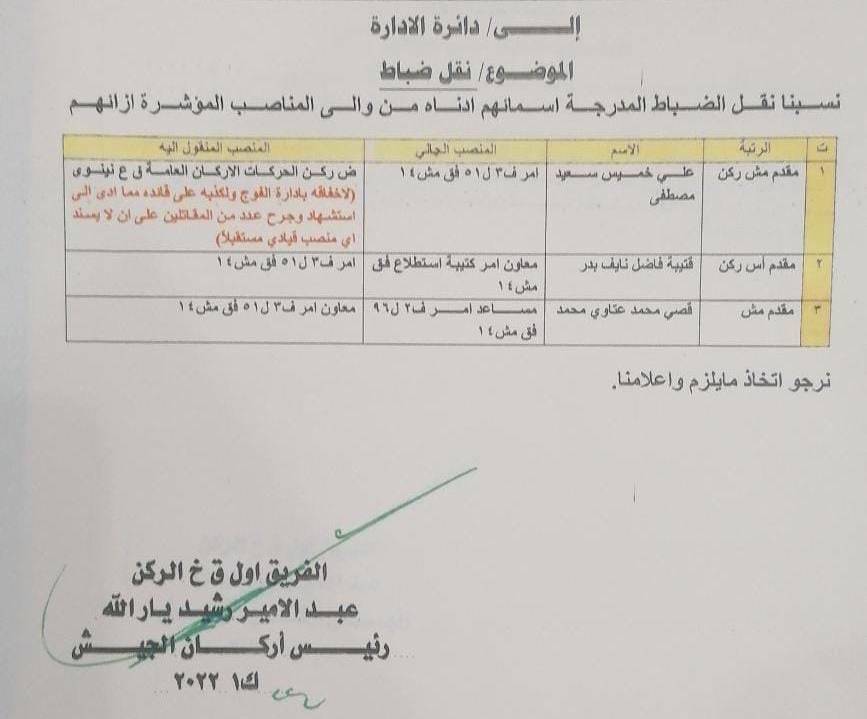 وأظهرت وثيقة حصلت عليها لوكالة هنا العراق فان الفريق الركن يار الله قرر نقل المقدم الركن علي خميس سعيد امر الفوج الثالث لواء 51 فرقة مشاة 14 الى ضابط ركن الحركات الأركان العامة قيادة عمليات نينوى“.