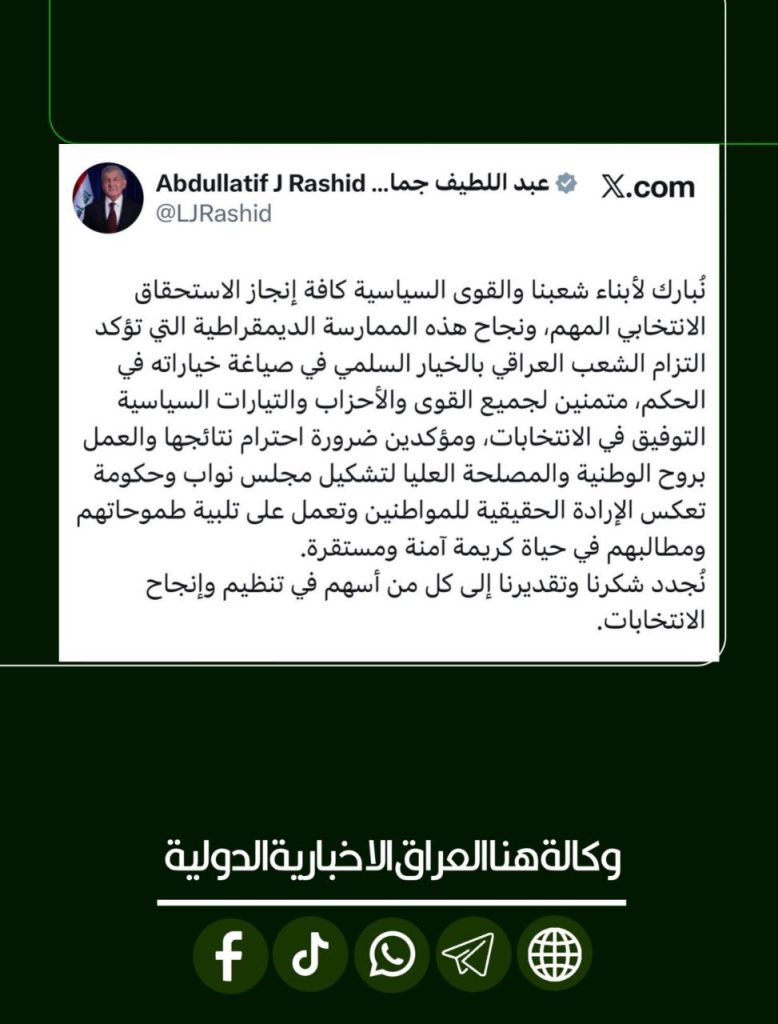 الرئيسية/سياسة/رئيس الجمهورية: نُبارك لأبناء شعبنا والقوى السياسية كافة إنجاز الاستحقاق الانتخابي المهم ونجاح هذه الممارسة الديمقراطية التي تؤكد التزام الشعب العراقي بالخيار السلمي في صياغة خياراته في الحكم سياسةمحلي رئيس الجمهورية: نُبارك لأبناء شعبنا والقوى السياسية كافة إنجاز الاستحقاق الانتخابي المهم ونجاح هذه الممارسة الديمقراطية التي تؤكد التزام الشعب العراقي بالخيار السلمي في صياغة خياراته في الحكم شاركها فيسبوك X لينكدإن Tumblr بينتيريست Reddit VKontakte Odnoklassniki Pocket مشاركة عبر البريد طباعة