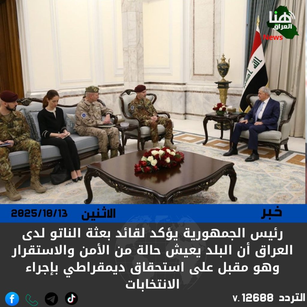 رئيس الجمهورية يؤكد لقائد بعثة الناتو لدى العراق أن البلد يعيش حالة من الأمن والاستقرار وهو مقبل على استحقاق ديمقراطي بإجراء الانتخابات