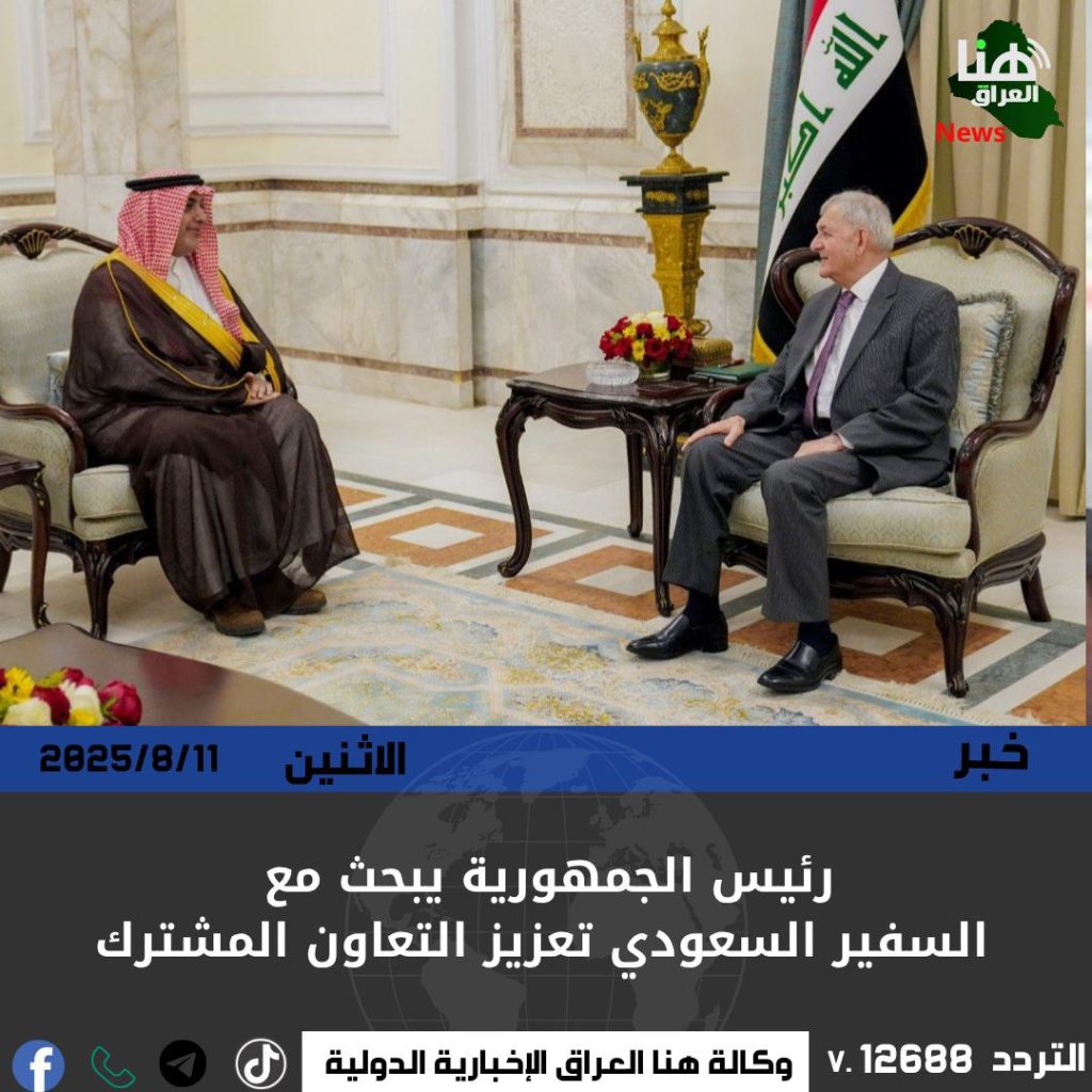 استقبل رئيس الجمهورية السفير السعودي لدى العراق، وبحث الجانبان تطوير آفاق التعاون المشترك بين بغداد والرياض في مختلف المجالات. وأكد رئيس الجمهورية حرص العراق على توسيع العلاقات بما يخدم مصالح الشعبين، فيما شدد السفير السعودي على التزام المملكة بدعم مسار التعاون مع العراق لتحقيق التقدم والازدهار والاستقرار.