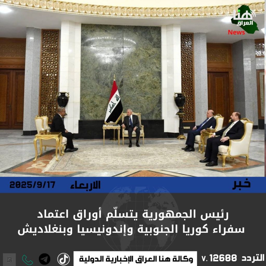 تسلّم رئيس الجمهورية الدكتور عبد اللطيف جمال رشيد، اليوم الأربعاء 17 أيلول 2025 في قصر بغداد، أوراق اعتماد سفراء كل من كوريا الجنوبية لي جون إل، وإندونيسيا ديديك أيكو بوجيانتو، وبنغلاديش محمد مقصودول حق.