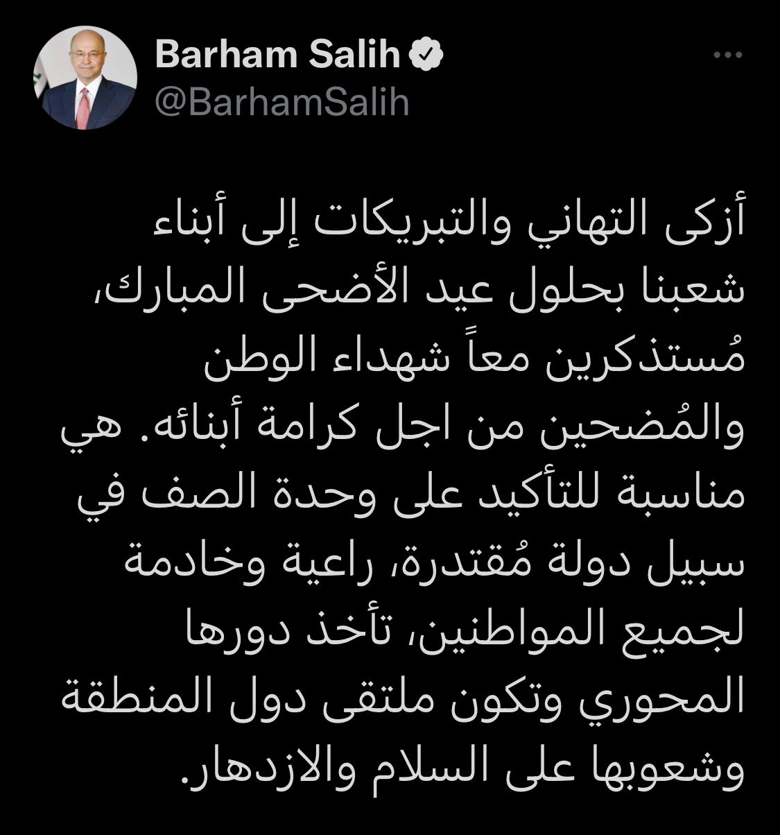 وقال صالح في تغريدة تابعتها اوكالة هنا العراق الاخبارية “أزكى التهاني والتبريكات إلى أبناء شعبنا بحلول عيد الأضحى المبارك، مُستذكرين معاً شهداء الوطن والمُضحين من اجل كرامة أبنائه”.