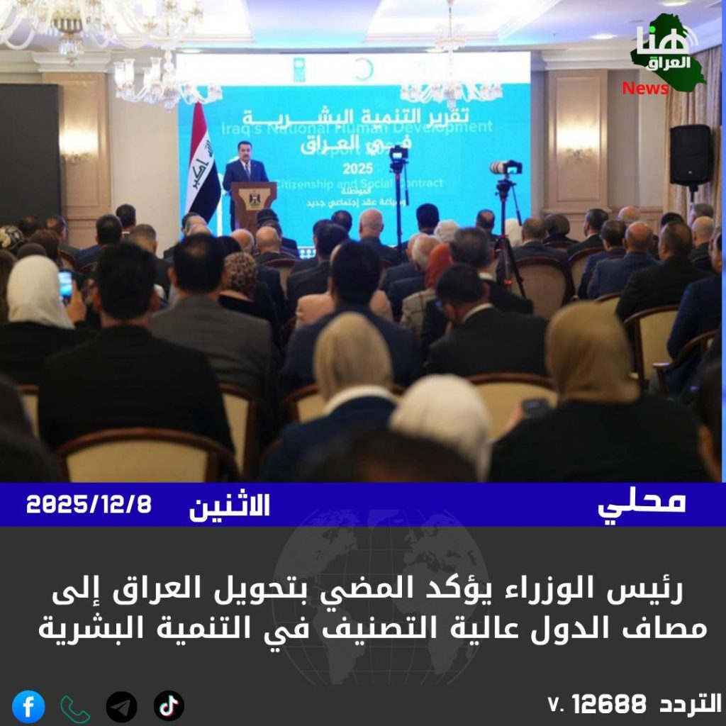 أكد رئيس مجلس الوزراء محمد شياع السوداني السير بتنفيذ خطة تنموية شاملة، تهدف إلى نقل العراق إلى مصاف الدول ذات التصنيف العالي في مستوى التنمية البشرية، مشيراً إلى أن تقرير التنمية البشرية الوطني لعام 2025 اتسم بالجرأة والواقعية والحياد، ويمثل فرصة لتجديد مضامين المواطنة وترسيخها.