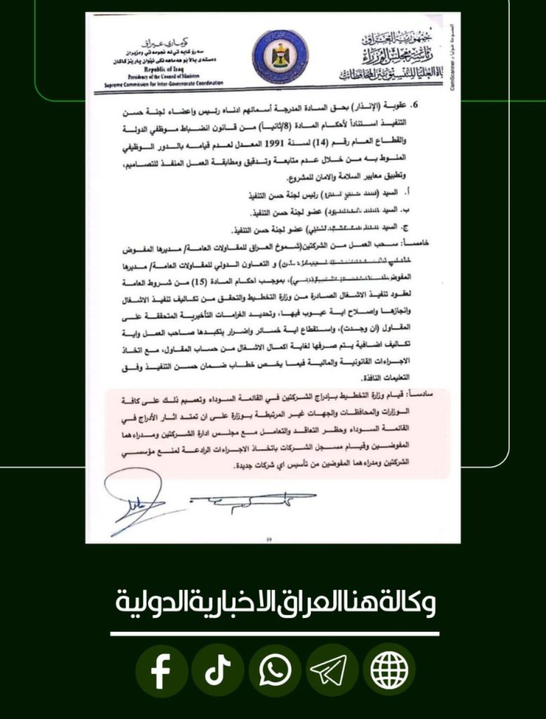 رئيس الوزراء يصادق على إدراج شركتي مجسر الحسينية في القائمة السوداء وسحب العمل منهما مع إجراءات قانونية بحق المدراء التنفيذيين