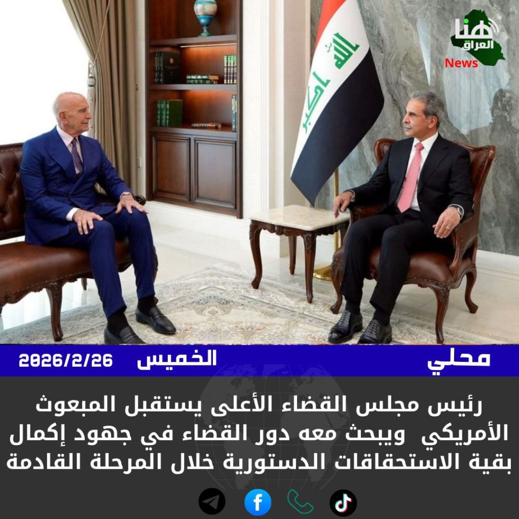 رئيس مجلس القضاء الأعلى القاضي فائق زيدان يستقبل المبعوث الأمريكي الخاص توم باراك ويبحث معه دور القضاء في جهود إكمال بقية الاستحقاقات الدستورية خلال المرحلة القادمة
