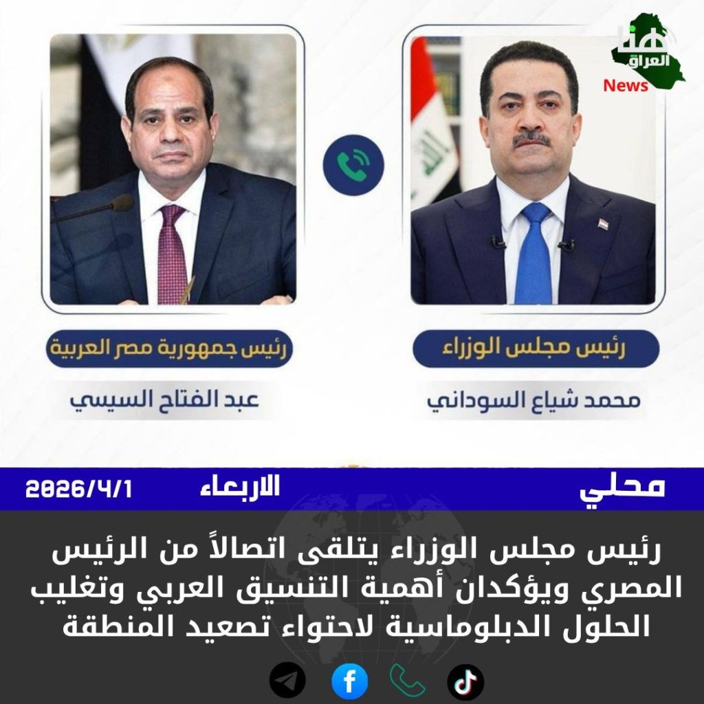 تلقى رئيس مجلس الوزراء محمد شياع السوداني اتصالاً هاتفياً من الرئيس المصري عبد الفتاح السيسي، جرى خلاله استعراض التطورات المتسارعة والتصعيد الذي تشهده المنطقة، إلى جانب تداعياته على الأمن والاستقرار الإقليمي.