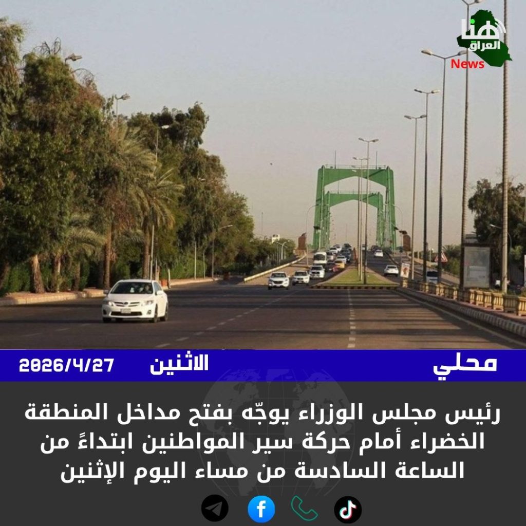 رئيس مجلس الوزراء محمد شياع السوداني يوجّه بفتح مداخل المنطقة الخضراء أمام حركة سير المواطنين ابتداءً من الساعة السادسة من مساء اليوم الإثنين