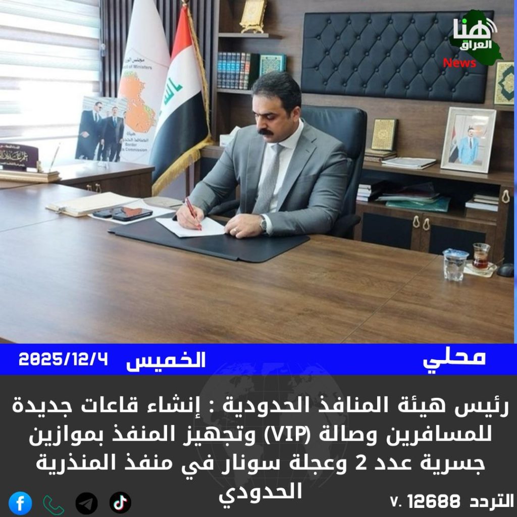 الرئيسية/امن/رئيس هيئة المنافذ الحدودية عمر الوائلي: إنشاء قاعات جديدة للمسافرين وصالة (VIP) وتجهيز المنفذ بموازين جسرية عدد 2 وعجلة سونار في منفذ المنذرية الحدودي امنمحلي رئيس هيئة المنافذ الحدودية عمر الوائلي: إنشاء قاعات جديدة للمسافرين وصالة (VIP) وتجهيز المنفذ بموازين جسرية عدد 2 وعجلة سونار في منفذ المنذرية الحدودي شاركها فيسبوك X لينكدإن Tumblr بينتيريست Reddit VKontakte Odnoklassniki Pocket مشاركة عبر البريد طباعة