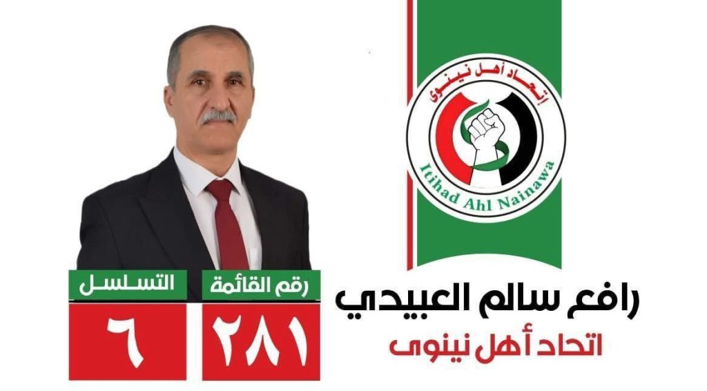 الخبير القضائي الأستاذ رافع سالم العبيدي، مرشح قائمة اتحاد أهل نينوى (رقم 281 – تسلسل 6)، يجسد مشروعًا عمليًا لخدمة أبناء نينوى والنهوض بواقعهم المعيشي، مؤمنًا بأن العمل العام ليس شعارًا انتخابيًا، بل مسؤولية وطنية تتجسد بالأفعال لا بالأقوال.