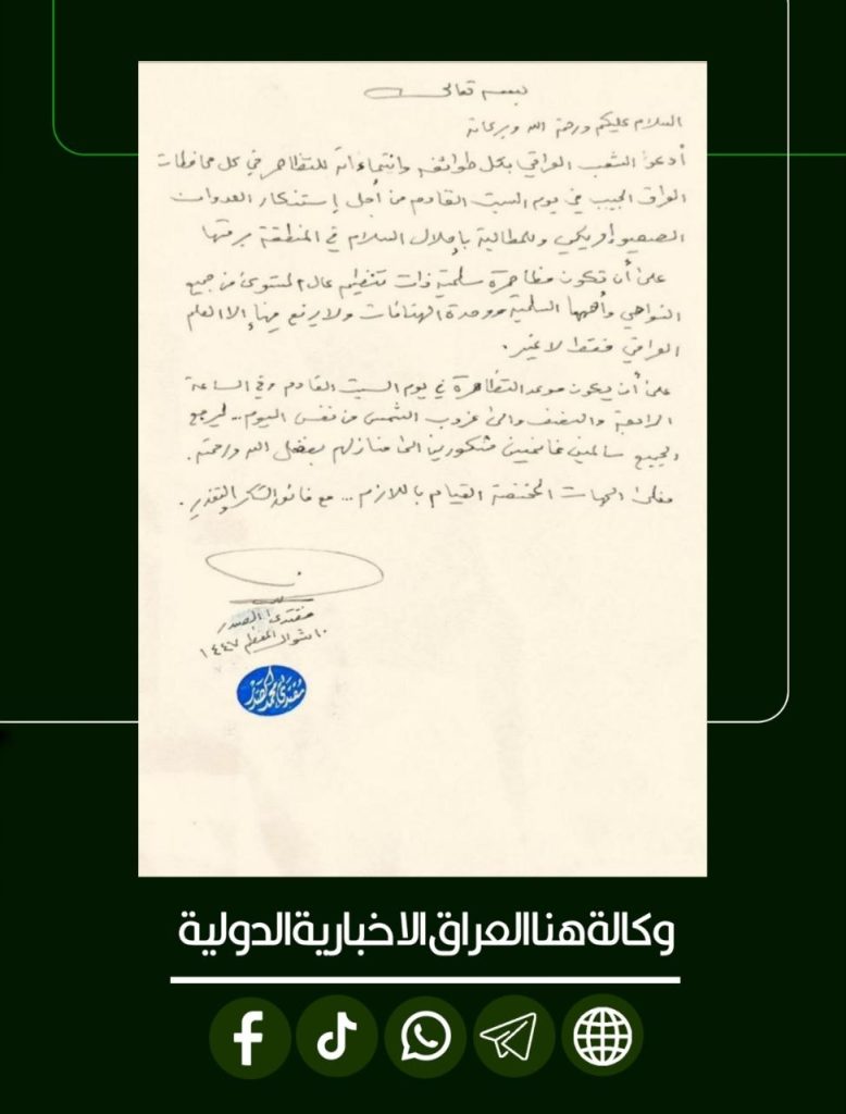 الرئيسية/سياسة/زعيم التيار الشيعي الوطني السيد مقتدى الصدر يدعو الشعب العراقي إلى التظاهر السبت المقبل لاستنكار العدوان الصهيوأمريكي والمطالبة بإحلال السلام بالمنطقة سياسةمحلي زعيم التيار الشيعي الوطني السيد مقتدى الصدر يدعو الشعب العراقي إلى التظاهر السبت المقبل لاستنكار العدوان الصهيوأمريكي والمطالبة بإحلال السلام بالمنطقة شاركها فيسبوك X لينكدإن Tumblr بينتيريست Reddit VKontakte Odnoklassniki Pocket مشاركة عبر البريد طباعة