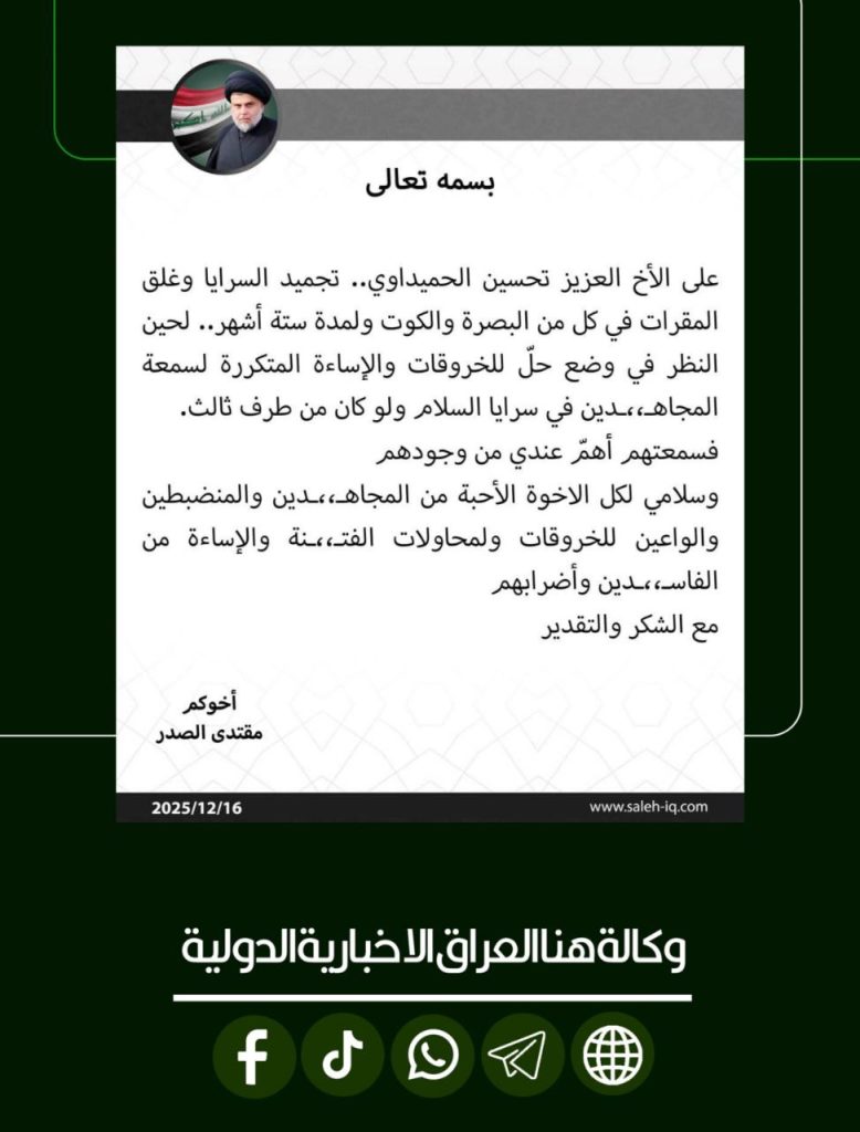الرئيسية/سياسة/زعيم التيار الوطني الشيعي السيد مقتدى الصدر يجمد سرايا السلام ويغلق مقراتهم في البصرة وواسط لمدة 6 أشهر سياسةمحلي زعيم التيار الوطني الشيعي السيد مقتدى الصدر يجمد سرايا السلام ويغلق مقراتهم في البصرة وواسط لمدة 6 أشهر شاركها فيسبوك X لينكدإن Tumblr بينتيريست Reddit VKontakte Odnoklassniki Pocket مشاركة عبر البريد طباعة