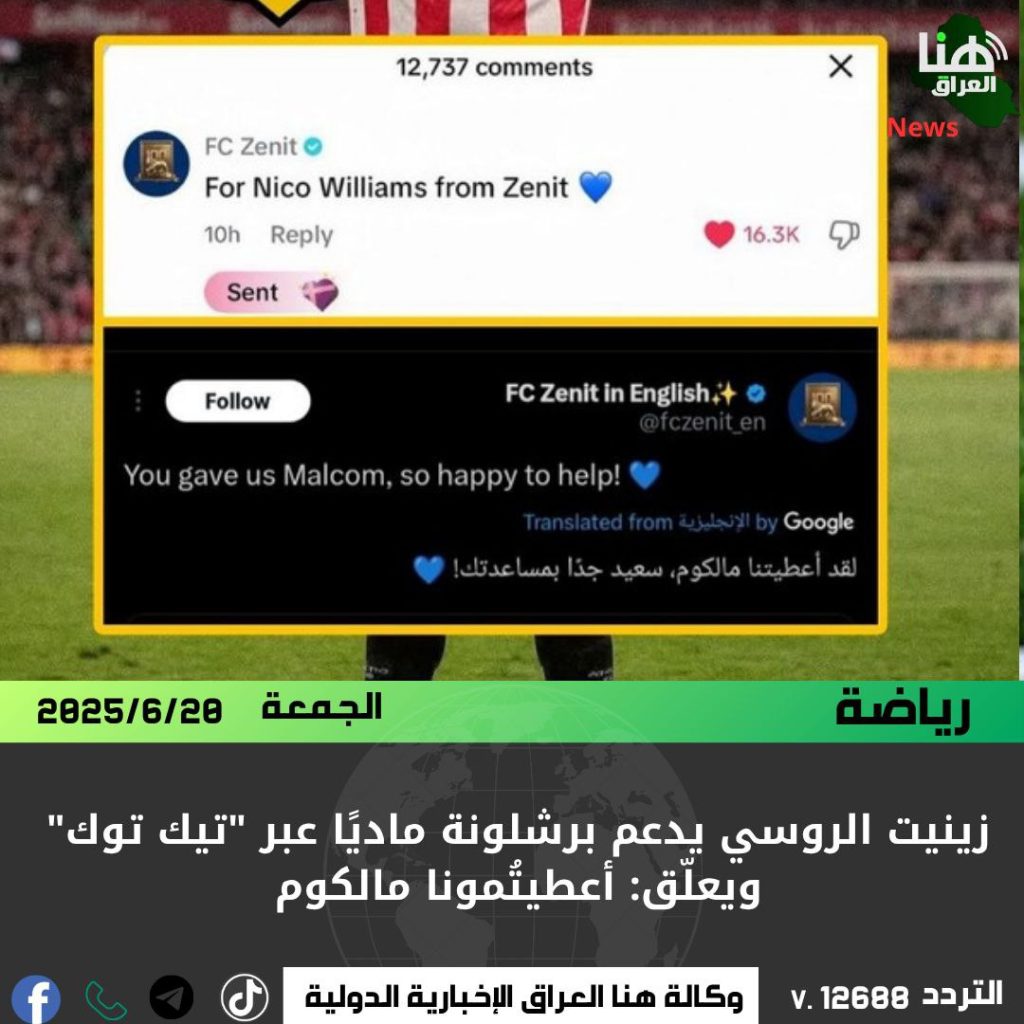 زينيت نشر بيانًا ساخرًا عبر حسابه الرسمي في منصة “إكس”، قال فيه: “لقد أعطيتُمونا مالكوم.. نحن سعيدون جدًا بمساعدتكم!”، في إشارة إلى انتقال النجم البرازيلي مالكوم من برشلونة إلى النادي الروسي في وقت سابق.