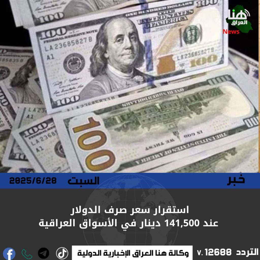 شهدت أسواق العملات في بغداد وأربيل والبصرة، اليوم السبت، استقراراً في سعر صرف الدولار الأميركي أمام الدينار العراقي، حيث بلغ سعر البيع 141,500 دينار لكل 100 دولار، فيما تراوح الشراء بين 141,000 و141,250 دينار.