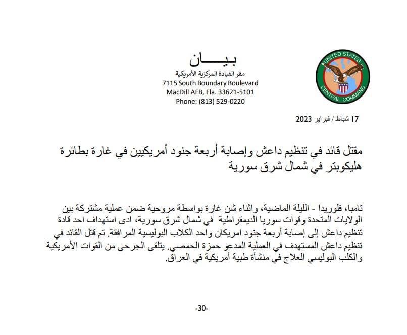 وقالت القيادة في بيان مقتضب، أن “حمزة الحمصي القيادي البارز في تنظيم داعش قتل خلال عملية يوم أمس، شمال شرقي سوريا“.