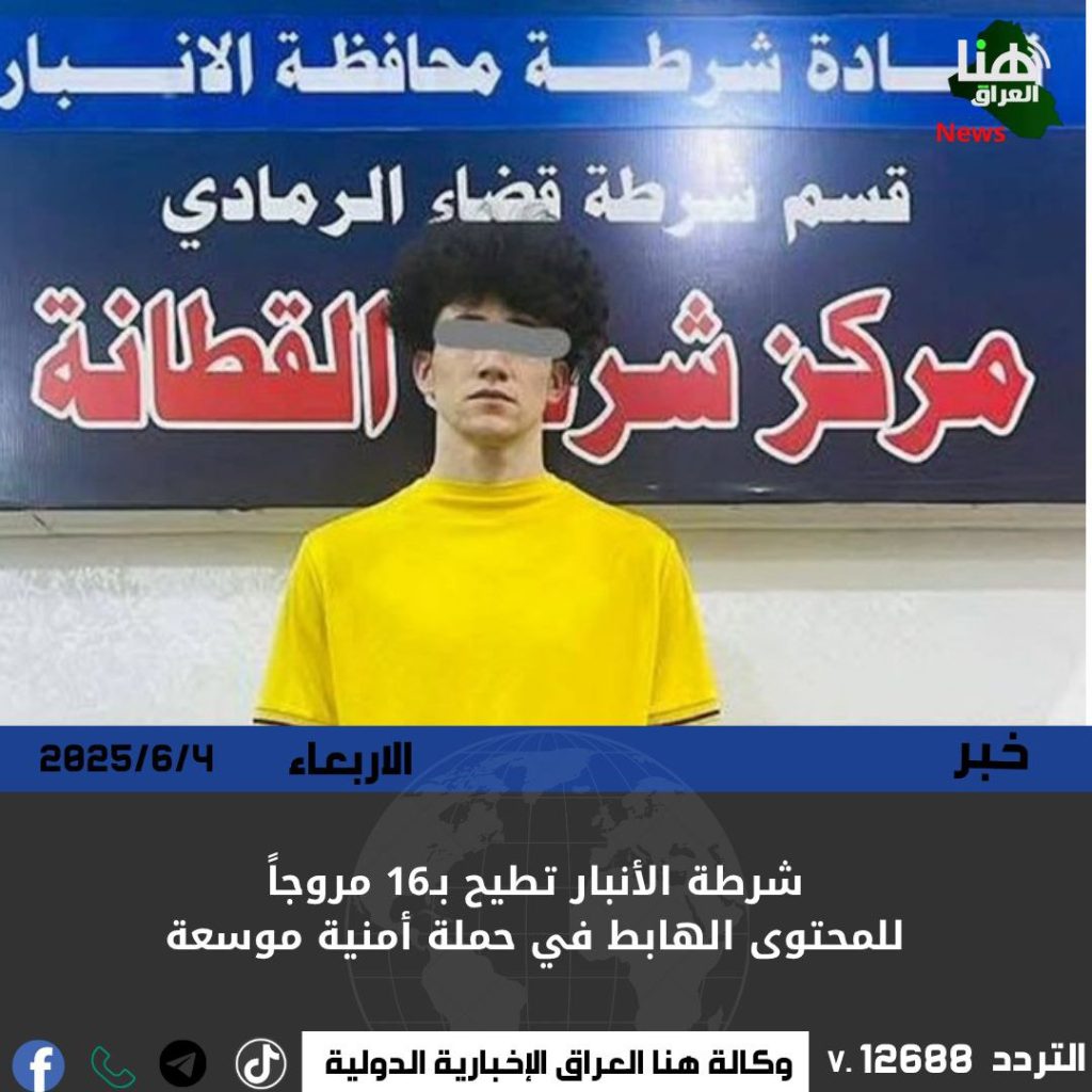 أعلنت قيادة شرطة محافظة الأنبار، اليوم الأربعاء، عن تنفيذ عملية أمنية ناجحة أسفرت عن اعتقال 16 من أبرز مروجي المحتوى الهابط، ضمن حملة تهدف للحفاظ على القيم المجتمعية وملاحقة المخالفين للذوق العام.