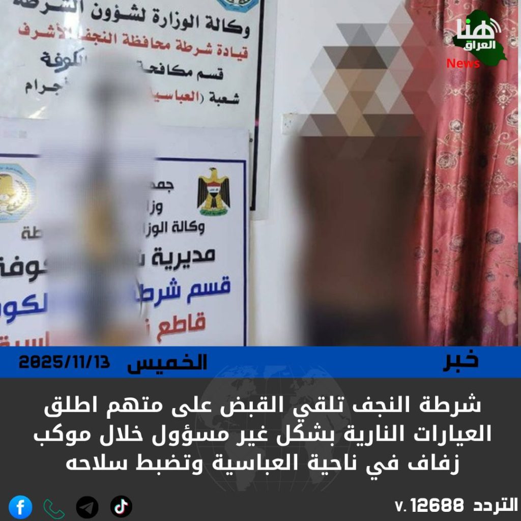 الرئيسية/امن/شرطة النجف تلقي القبض على متهم اطلق العيارات النارية بشكل غير مسؤول خلال موكب زفاف في ناحية العباسية وتضبط سلاحه امنمحلي شرطة النجف تلقي القبض على متهم اطلق العيارات النارية بشكل غير مسؤول خلال موكب زفاف في ناحية العباسية وتضبط سلاحه