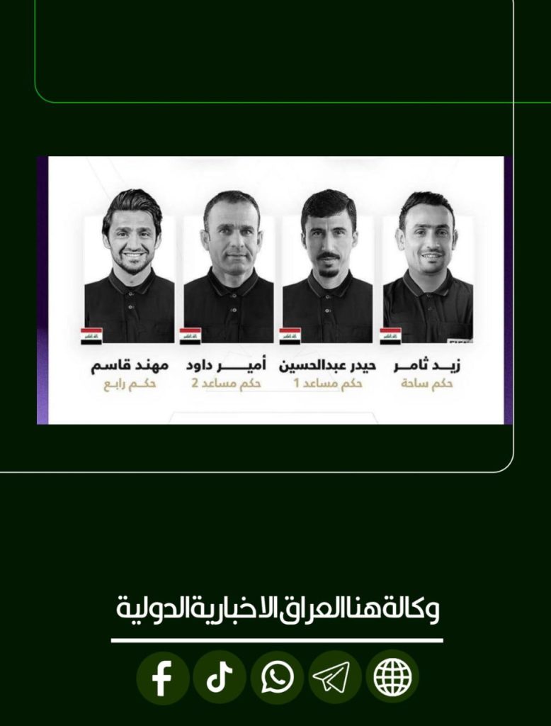 يتألف الطاقم من “زيد ثامر” حكماً للساحة، والحكمان المساعدان “حيدر عبد الحسين” و “أمير داود”، وسيكون “مهند قاسم” حكماً رابعاً.