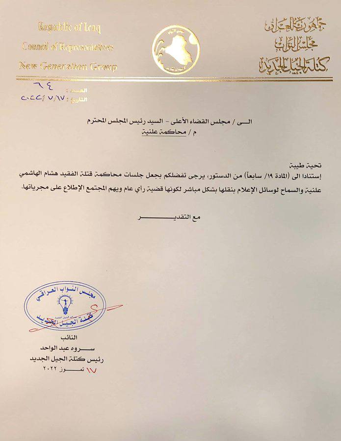وخاطبت عبد الواحد مجلس القضاء الأعلى في وثيقة وردت لوكالة هنا العراق الاخبارية “استنادا إلى (المادة 19/ سابعا) من الدستور يرجى تفضلكم بجعل جلسات محاكمة قتلة الفقيد هشام الهاشمي علنية، والسماح بوسائل الإعلام بنقلها بشكل مباشر لكونها قضية رأي عام ويهم المجتمع الاطلاع على مجرياتها”.