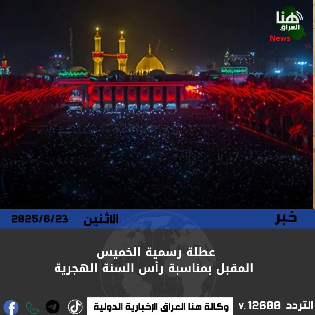 أعلنت الأمانة العامة لمجلس الوزراء أن يوم الخميس المقبل، الموافق 26 حزيران 2025، سيكون عطلة رسمية بمناسبة الأول من شهر محرم الحرام وحلول رأس السنة الهجرية.