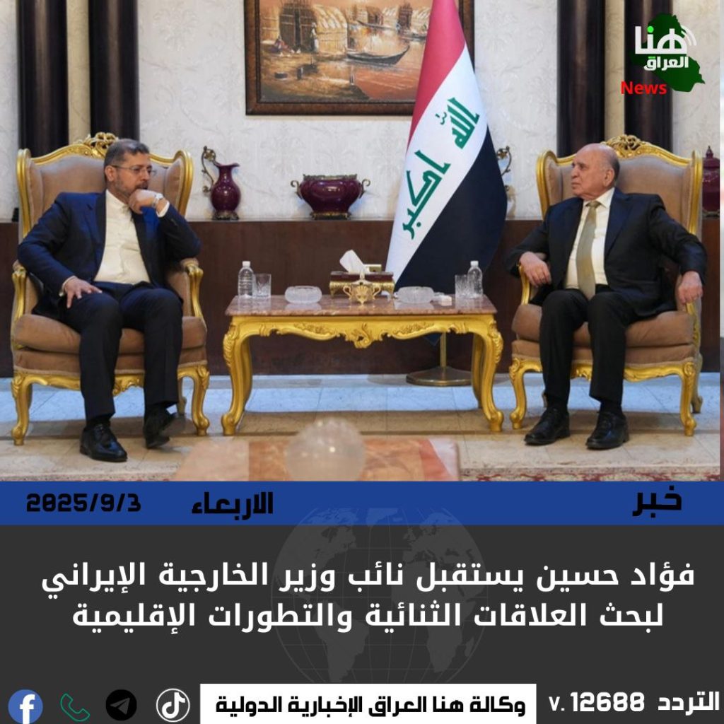 استقبل نائب رئيس مجلس الوزراء ووزير الخارجية فؤاد حسين، في بغداد يوم الثلاثاء (2 أيلول 2025)، نائب وزير الخارجية الإيراني سعيد خطيب زادة، لبحث مسار العلاقات الثنائية والتطورات الإقليمية والدولية.