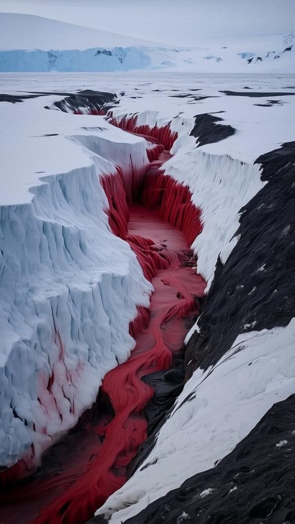 عند حافة نهر جليدي يُدعى تايلور، يخرج من جدار جليدي أبيض ناصع تيار أحمر قاتم يشبه الدم، ليغطي الجليد المتجمد بمشهد غريب حيّر المستكشفين لعقود.