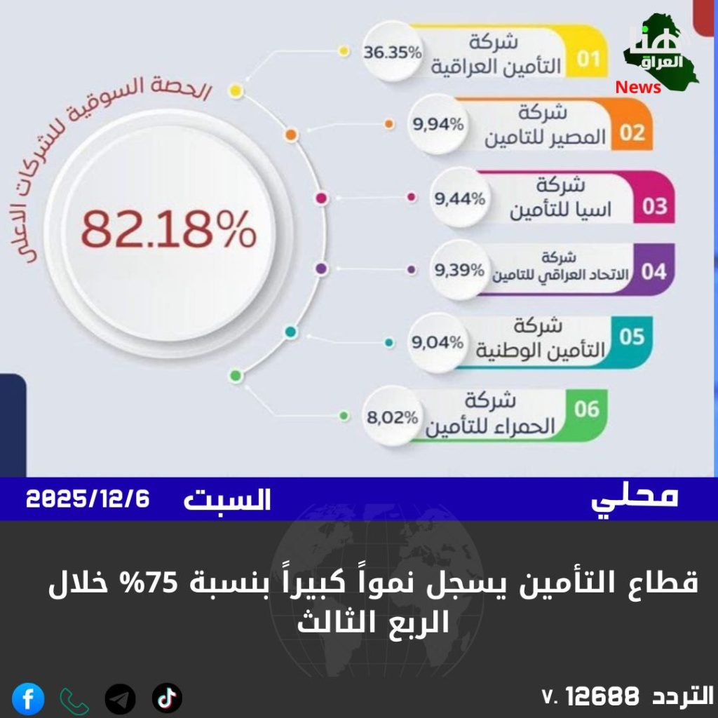 أعلنت شركة التأمين العراقية عن تسجيل ارتفاع كبير في أقساط التأمين بنسبة تجاوزت 75% خلال الربع الثالث من عام 2025، بإجمالي أقساط بلغ أكثر من 207 مليارات دينار.