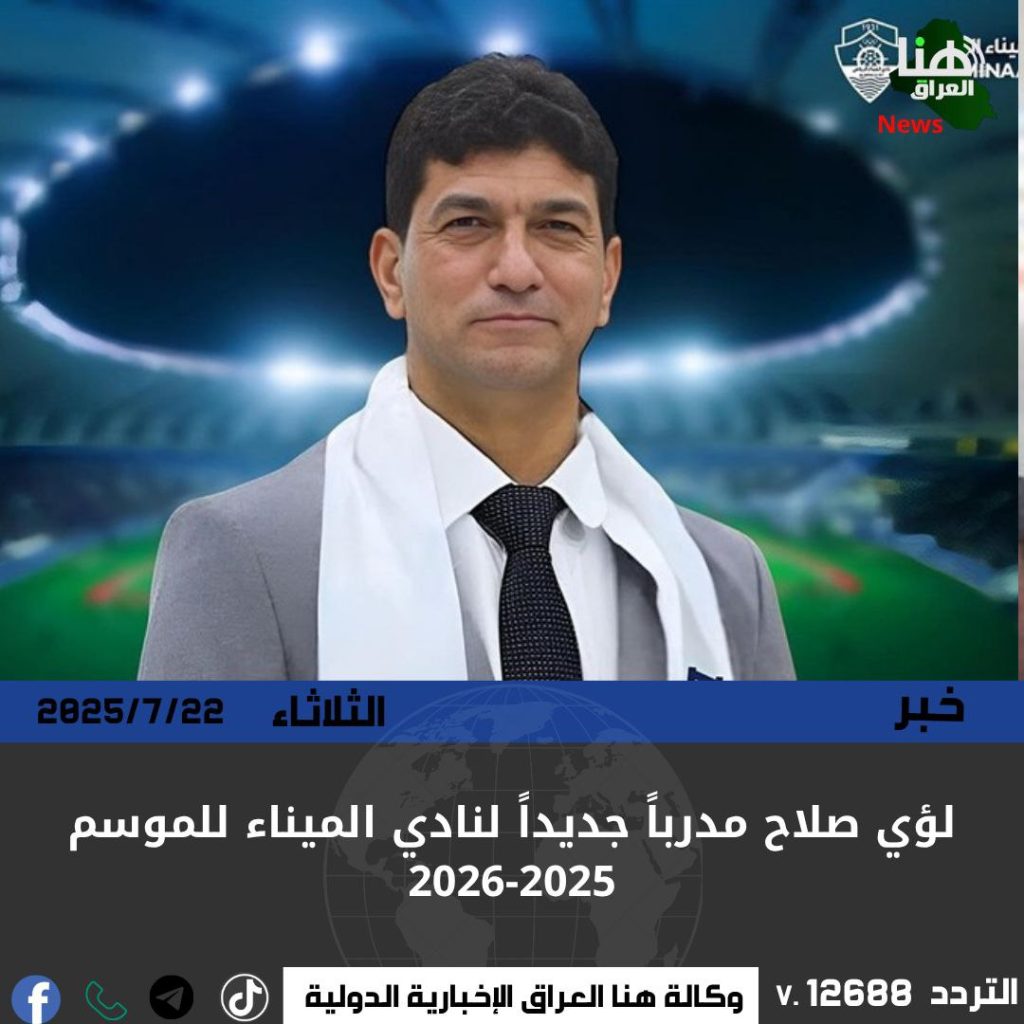 أعلن نادي الميناء الرياضي التعاقد رسمياً مع المدرب لؤي صلاح لقيادة فريق كرة القدم في الموسم المقبل، ضمن جهاز فني يضم هلكرد ملا محمد، أوس إبراهيم، عامر عبد الوهاب، ومحمد مصطفى، إضافة إلى محللي الأداء خالد حسين وحسام راسم.
