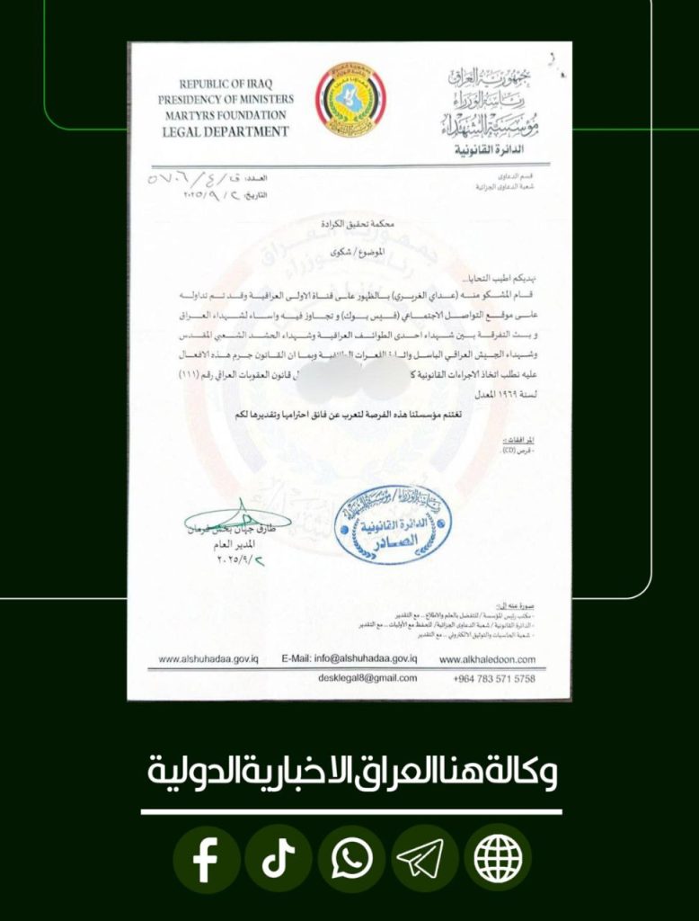 الرئيسية/محلي/لتجاوزه على الشهداء.. مؤسسة الشهداء تقيم دعوى قضائية ضد المدعو “عداي الغريري” محلي لتجاوزه على الشهداء.. مؤسسة الشهداء تقيم دعوى قضائية ضد المدعو “عداي الغريري” شاركها فيسبوك X لينكدإن Tumblr بينتيريست Reddit VKontakte Odnoklassniki Pocket مشاركة عبر البريد طباعة