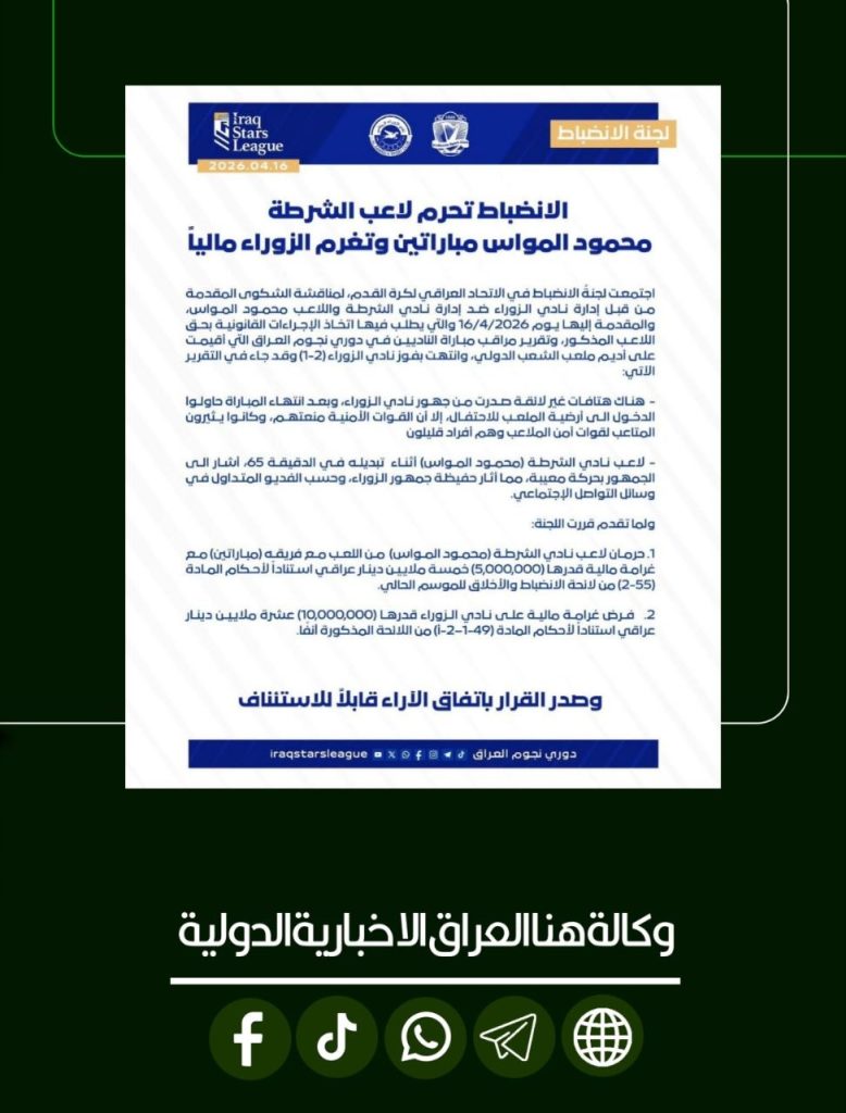 الرئيسية/رياضة/لجنة الانضباط تحرم لاعب الشرطة محمود المواس مباراتين وتغرّم نادي الزوراء 10 ملايين دينار على خلفية أحداث مباراة الفريقين في دوري نجوم العراق رياضة لجنة الانضباط تحرم لاعب الشرطة محمود المواس مباراتين وتغرّم نادي الزوراء 10 ملايين دينار على خلفية أحداث مباراة الفريقين في دوري نجوم العراق شاركها فيسبوك X لينكدإن Tumblr بينتيريست Reddit VKontakte Odnoklassniki Pocket مشاركة عبر البريد طباعة