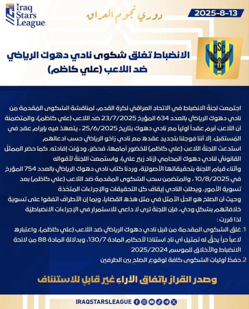 الرئيسية/رياضة/لجنة الانضباط في اتحاد الكرة تغلق شكوى دهوك ضد اللاعب علي كاظم بعد تسوية ودية وتعتبره لاعباً حراً رياضة لجنة الانضباط في اتحاد الكرة تغلق شكوى دهوك ضد اللاعب علي كاظم بعد تسوية ودية وتعتبره لاعباً حراً شاركها فيسبوك X لينكدإن Tumblr بينتيريست Reddit VKontakte Odnoklassniki Pocket مشاركة عبر البريد طباعة