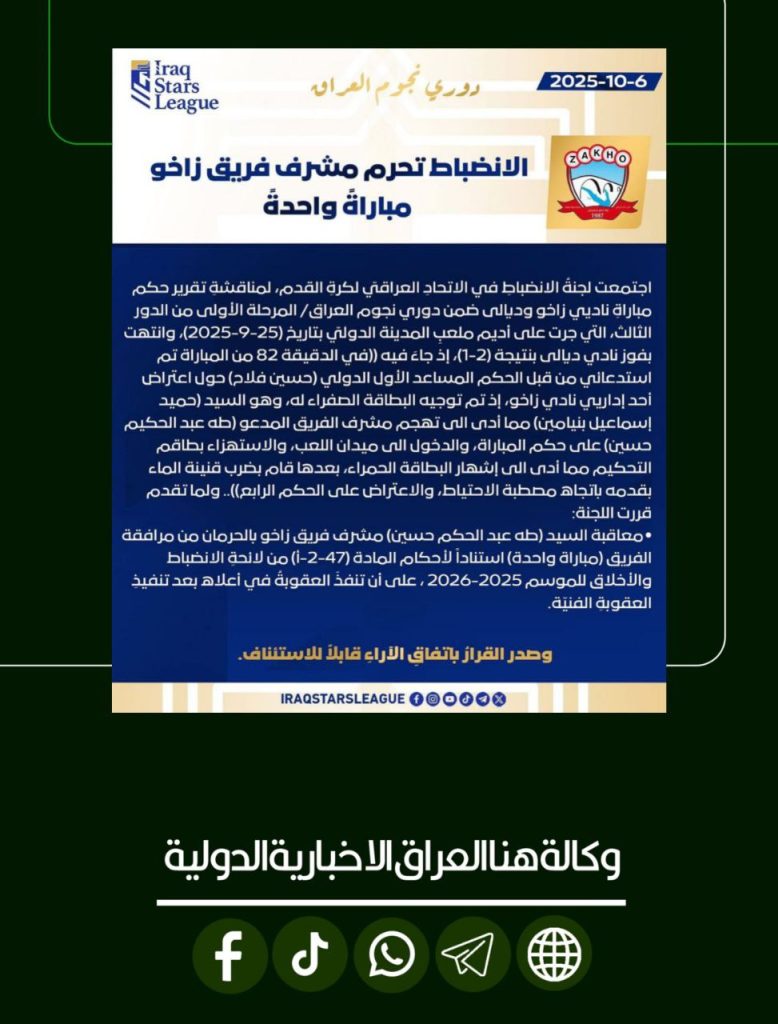 الرئيسية/رياضة/لجنة الانضباط في اتحاد الكرة تقرر حرمان مشرف فريق زاخو مباراة واحدة بسبب تهجمه واستهزائه بطاقم التحكيم رياضة لجنة الانضباط في اتحاد الكرة تقرر حرمان مشرف فريق زاخو مباراة واحدة بسبب تهجمه واستهزائه بطاقم التحكيم شاركها فيسبوك X لينكدإن Tumblr بينتيريست Reddit VKontakte Odnoklassniki Pocket مشاركة عبر البريد طباعة