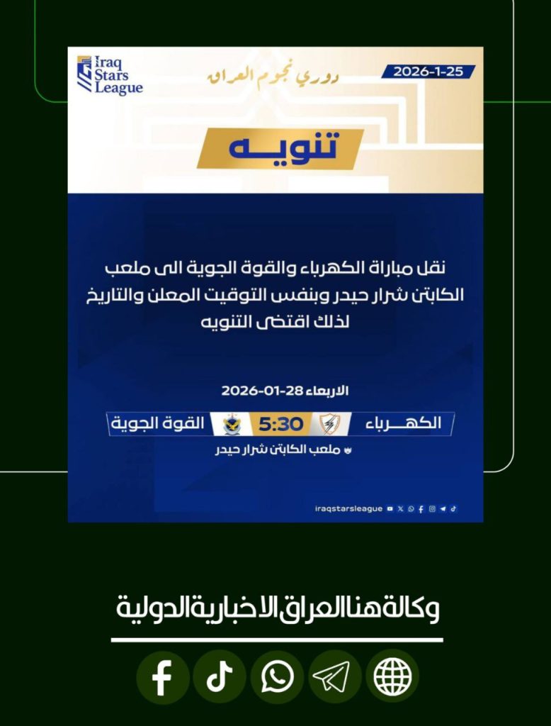 الرئيسية/رياضة/لجنة المسابقات تقرر نقل مباراة الكهرباء والقوة الجوية ضمن مواجهات دوري نجوم العراق الى ملعب الكابتن (شرار حيدر) رياضة لجنة المسابقات تقرر نقل مباراة الكهرباء والقوة الجوية ضمن مواجهات دوري نجوم العراق الى ملعب الكابتن (شرار حيدر) شاركها فيسبوك X لينكدإن Tumblr بينتيريست Reddit VKontakte Odnoklassniki Pocket مشاركة عبر البريد طباعة