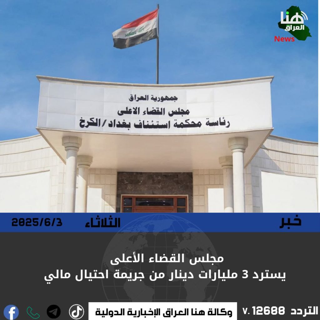 أعلن مجلس القضاء الأعلى، اليوم، استرداد مبلغ 3 مليارات دينار ضمن ملف جريمة احتيال مالي، مؤكداً استمرار جهوده في استرجاع المال العام من خلال تفعيل الإجراءات القضائية الصارمة بحق المتورطين.