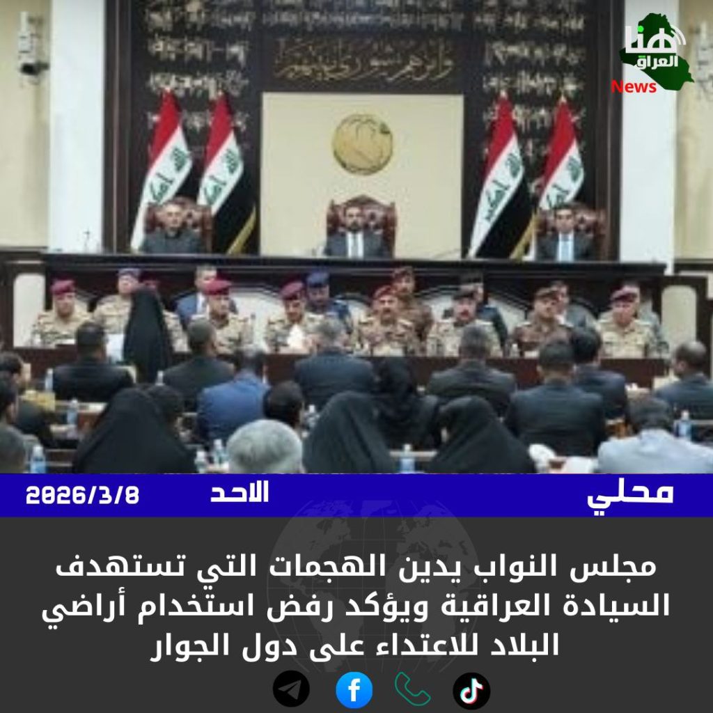 أدان مجلس النواب العراقي جميع الهجمات التي تستهدف السيادة العراقية ومواقع القوات الأمنية والعسكرية، مؤكداً رفضه القاطع لاستخدام الأراضي أو الأجواء العراقية في أي أعمال عدائية تُوجَّه ضد دول الجوار.