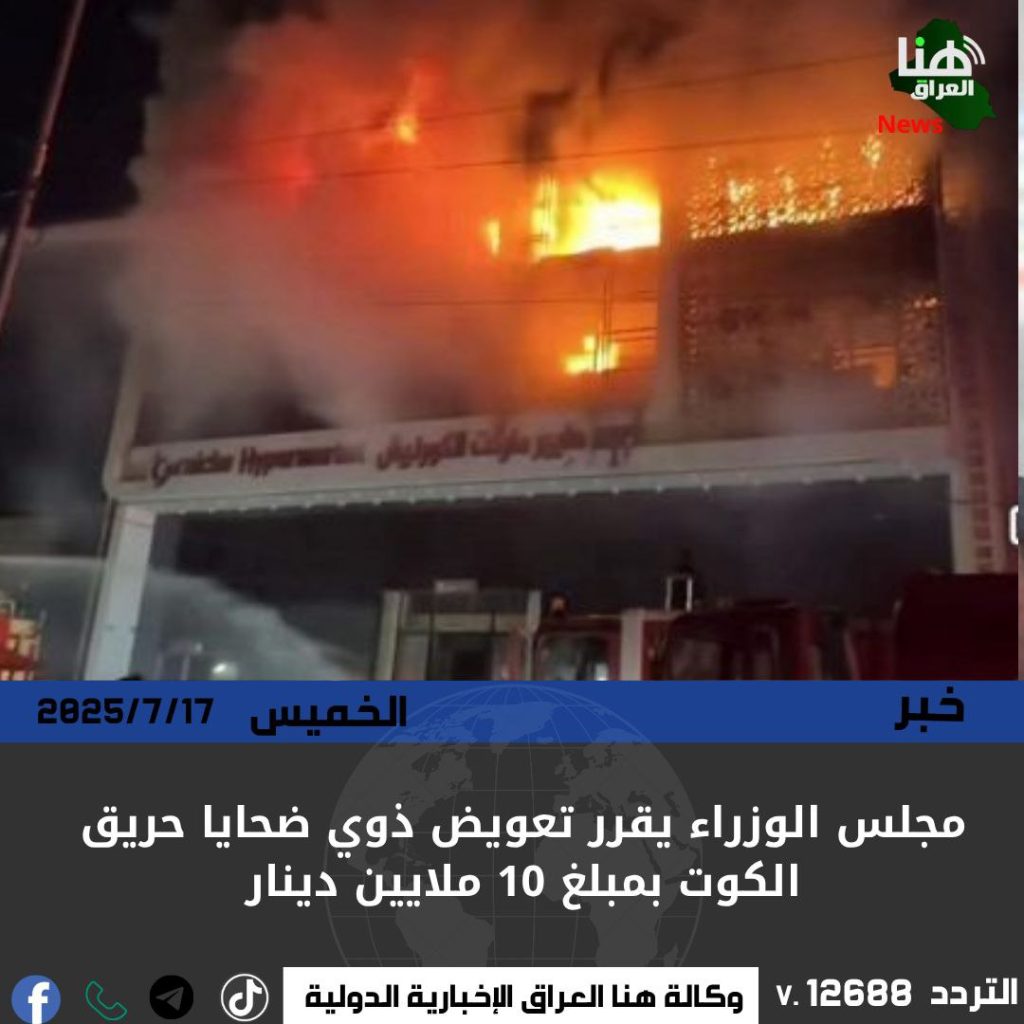 أقرّ مجلس الوزراء، في جلسته الأخيرة، منح تعويض مالي قدره 10 ملايين دينار لكل عائلة من ذوي الضحايا الذين قضوا في حادثة الحريق المأساوي الذي اندلع في مول بمدينة الكوت.