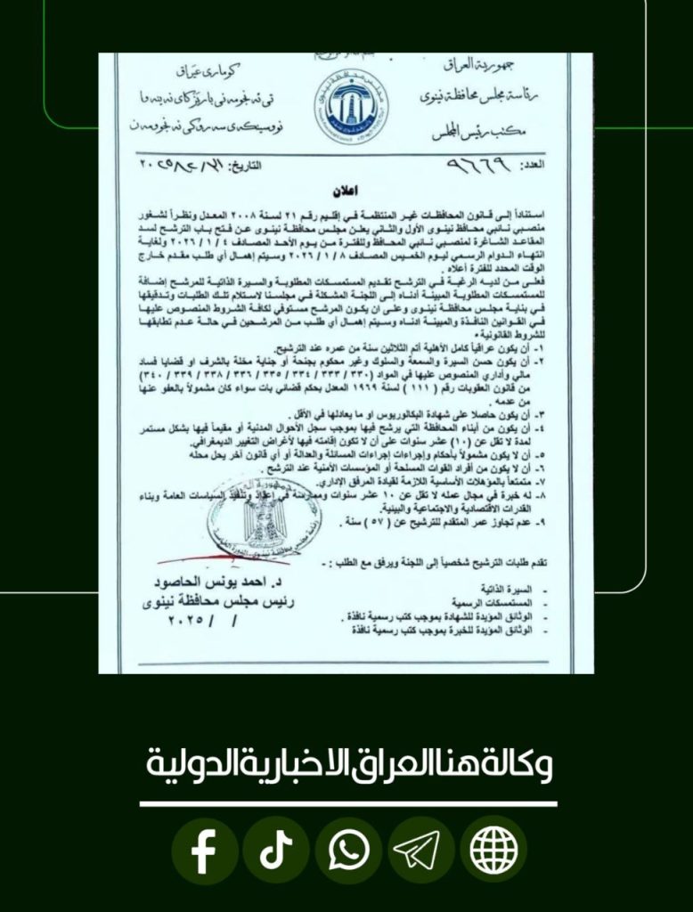 الرئيسية/سياسة/مجلس نينوى يفتح باب الترشيح لشغل منصبي نائبي المحافظ وفقاً للضوابط القانونية سياسةمحلي مجلس نينوى يفتح باب الترشيح لشغل منصبي نائبي المحافظ وفقاً للضوابط القانونية شاركها فيسبوك X لينكدإن Tumblr بينتيريست Reddit VKontakte Odnoklassniki Pocket مشاركة عبر البريد طباعة